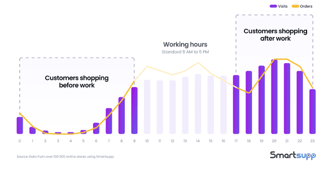 According to Smartsupp data from over 100,000 online shops worldwide, up to two-thirds of all orders are placed outside regular business hours. In Germany and the UK, the peak shopping time is between 8 and 9 PM. By that time, most support teams have logged off. On weekends alone, customers send 21.3% of all chat enquiries.